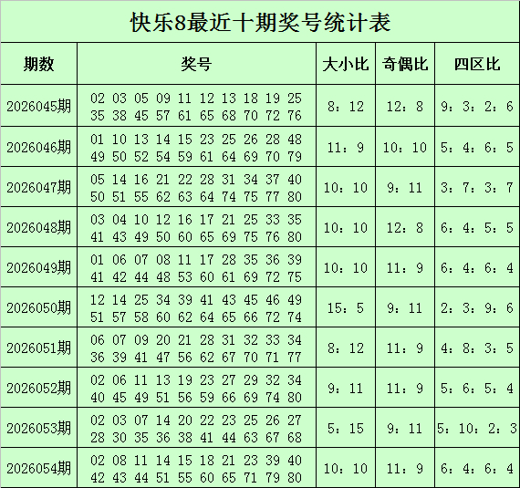 福彩疯狂8第2026054期开奖回想:02 08 11 14 15 18 21 23 39 40 42 43 44 51 55 60 65 71 79 80,其中奖号四区比为6:4:6:4,奇偶比为11:9,大小比为10:10。